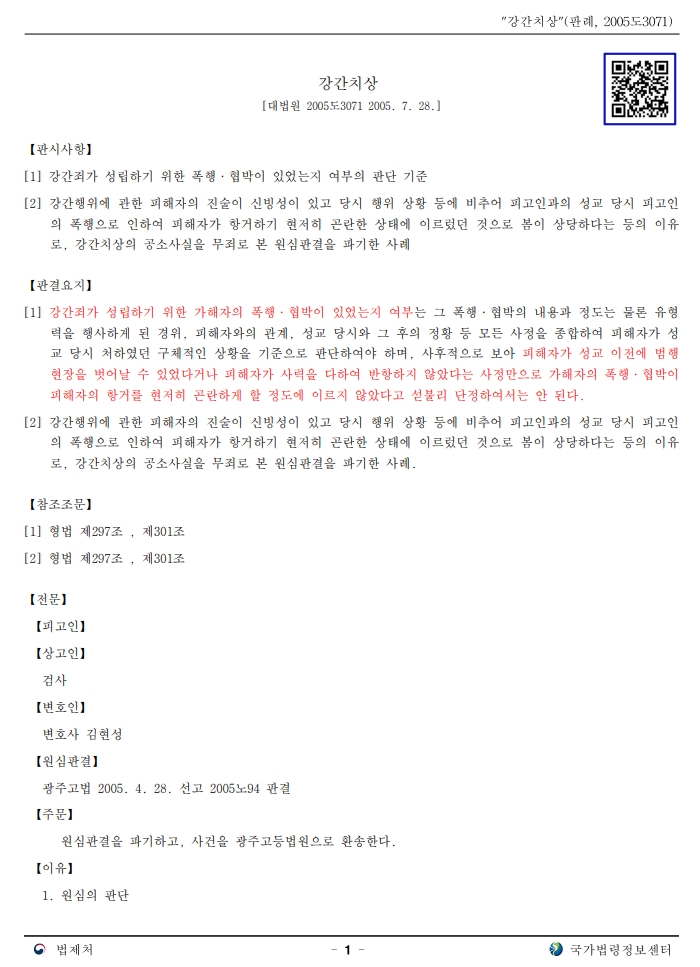 피해자가 적극적으로 방어하지 않았거나 반항의 흔적이 없다거나 가해자로부터 맞았거나 협박하지는 않았다가니 강간을 당하기 전에 범죄 현장을 벗어날 수 있었다는 사정만으로 강간죄가 성립하지 않는다고 섣불리 단정해서는 안된다.